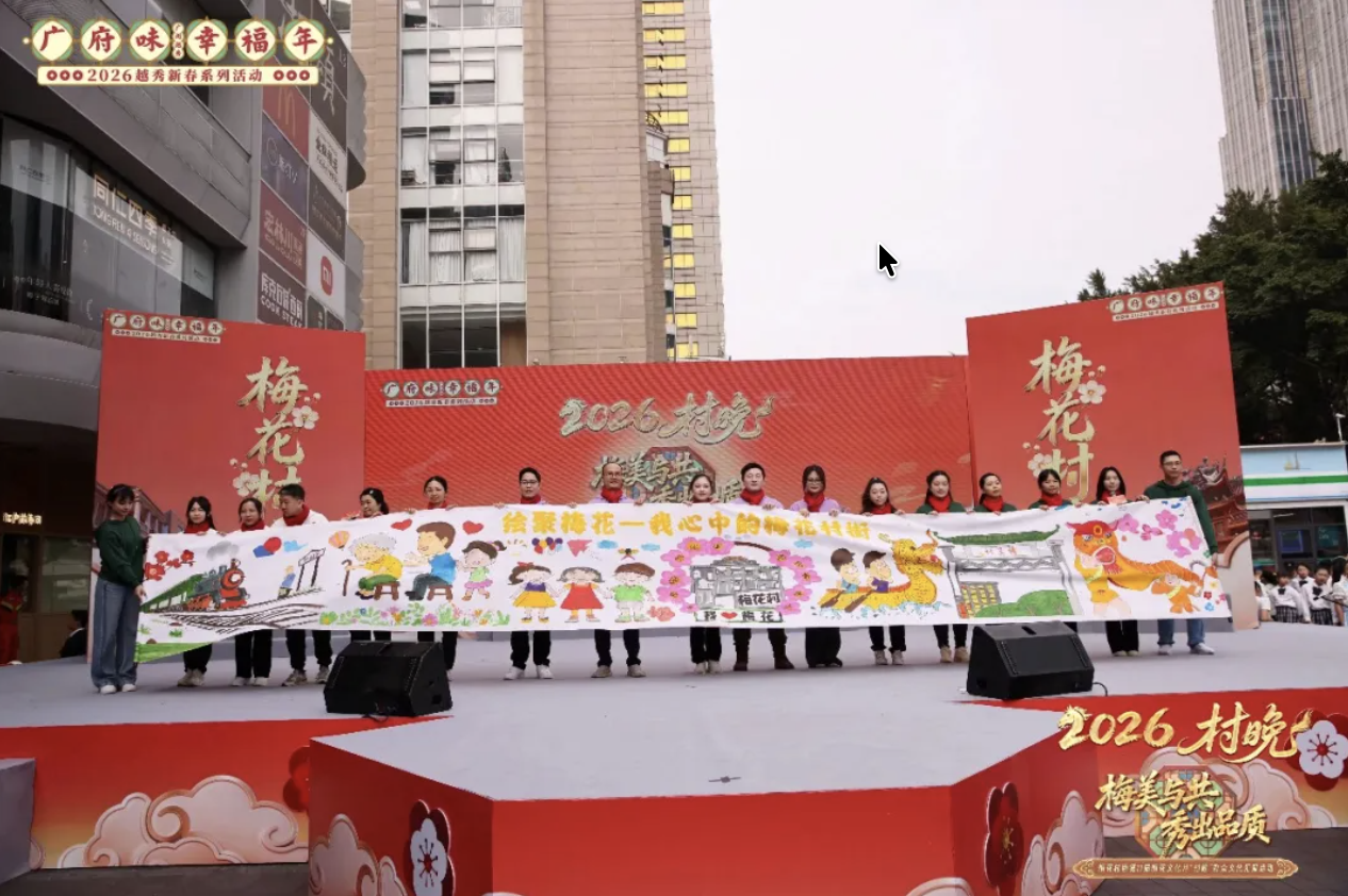 2026「东峻五养」喜赴“梅”好之约——1 月 29 日下午, “梅美与共・秀出品质”梅花村街第十一届梅花文化月群众文化汇演在外商新天地・外商艺龙酒店露天广场圆满落幕,「东峻五养」作为支持单位和列席嘉宾应邀出席活动现场,早前在东峻五养城广场绘就的十米长卷《绘聚梅花》也正式亮相。